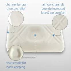 For side sleeping, large side sleeping areas keep head level for proper alignment of the spine. The airflow channels provide increased face & ear comfort. Channel for jaw pressure relief on each side of the pillow help reduce pressure on the jaw, making it more comfortable for people with TMJ or jaw pain.