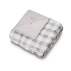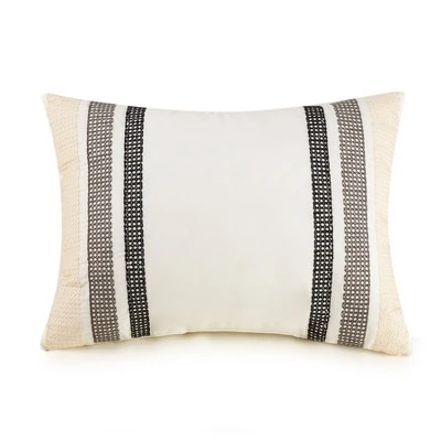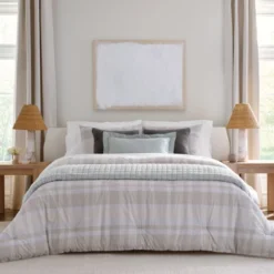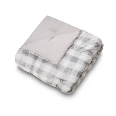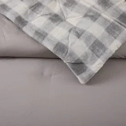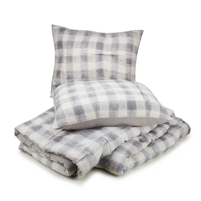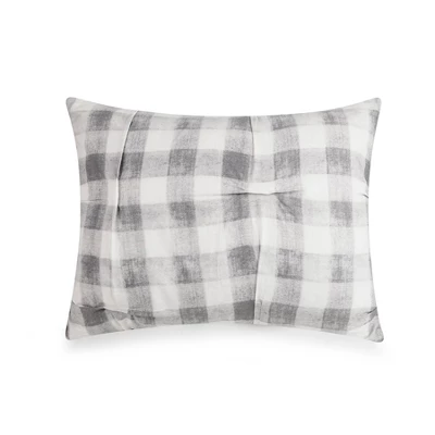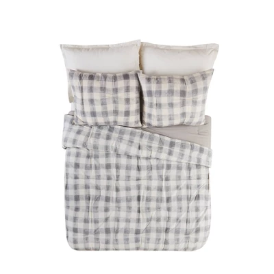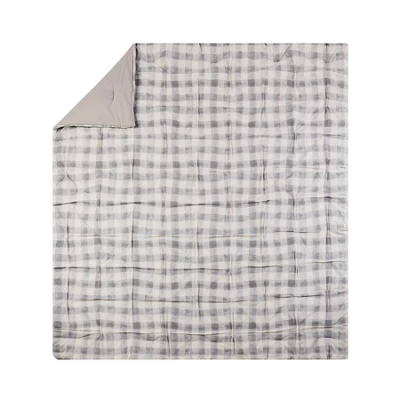 Bring a cozy casual vibe to your room with the Maddie Comforter. This print is a modern take on buffalo check with texture. This comfortable cotton fabric is crafted with tucks to add some texture and style. This bedding set is complete with two matching decorative pillows. The square pillow is a grey heathered soft chenille. The oblong pillow is ecru cotton with stripes of embroidery.