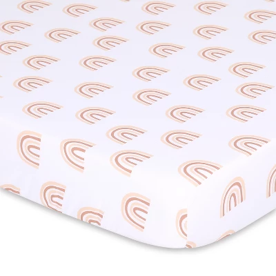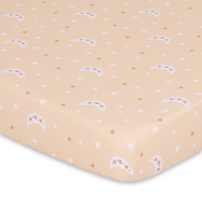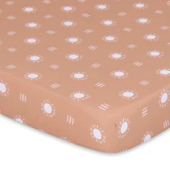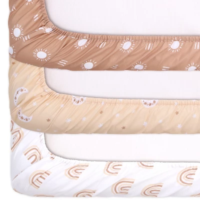 The Beautiful Boho playard sheet set from The Peanutshell includes 3 unique bohemian themed allover prints in shades of rust, clay and white. A sunny geometric tossed print; celestial moons; and a tonal rainbow pattern make up this well-curated trio. The all-around elastic design ensures a safe and snug fit that’s compatible with most standard playard mattresses. The fade-resistant material is quick-drying and machine washable, providing excellent quality and easy care at a great value.
